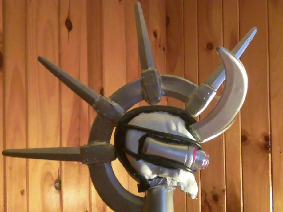 I used a dollar store skull, 4 dollar store sickles to make the mount and horns, with the base of the sickles used for the base of the spikes which was dollar store sais.