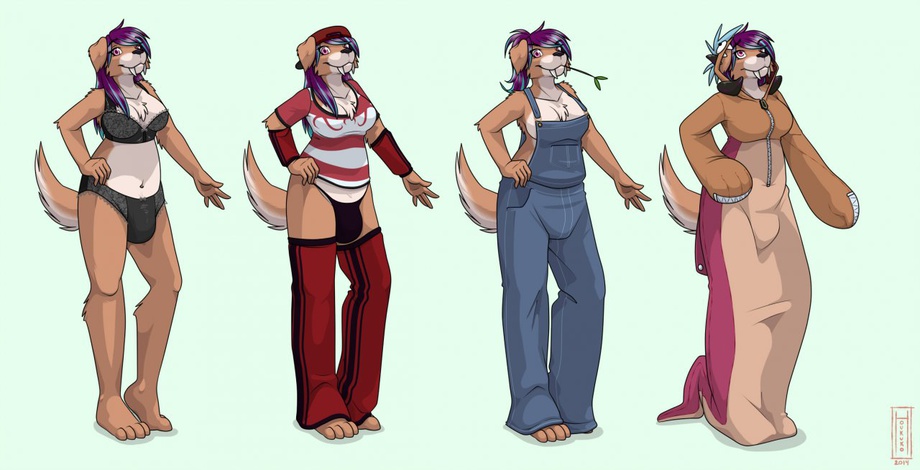 first we got some panties and stuff! so cute! Then of course her original weird outfit. Overalls, for when she is working on her mechanic stuff! Not sure what is with her being shirtless tho, going to get oil on your fur, stupid! Last but no least, her "jammys" huh? huh? get it? i... i'll go in my corner now...