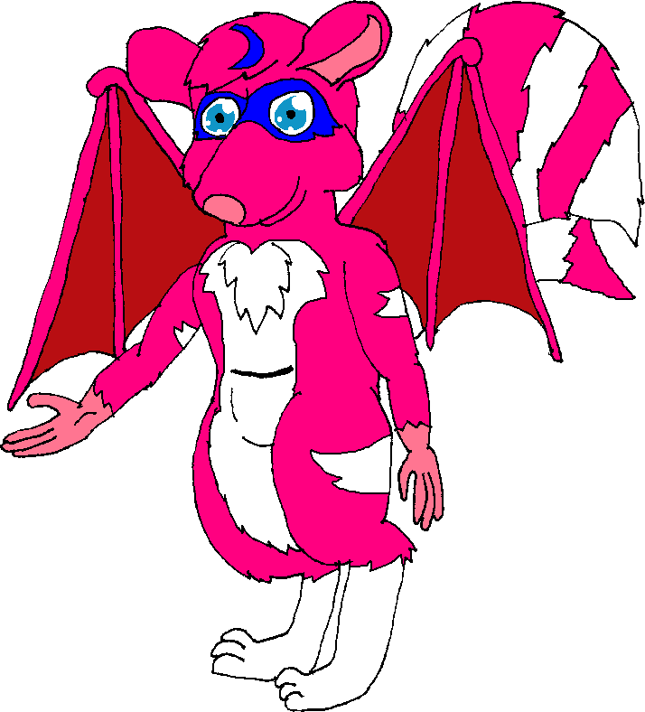 Digitigrade legs, hot pink fur over most of the body, white fur marking such areas as the chest and belly, two striped tails, blue face markings and scrotum.