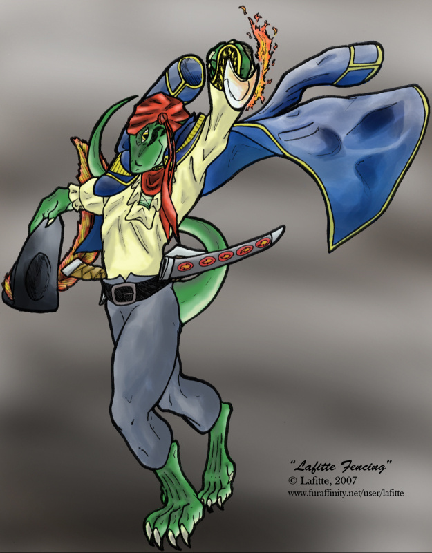 Pretty straightforward. Lafitte the lizardfolk pirate fencing with a magical, flame powered cutlass.