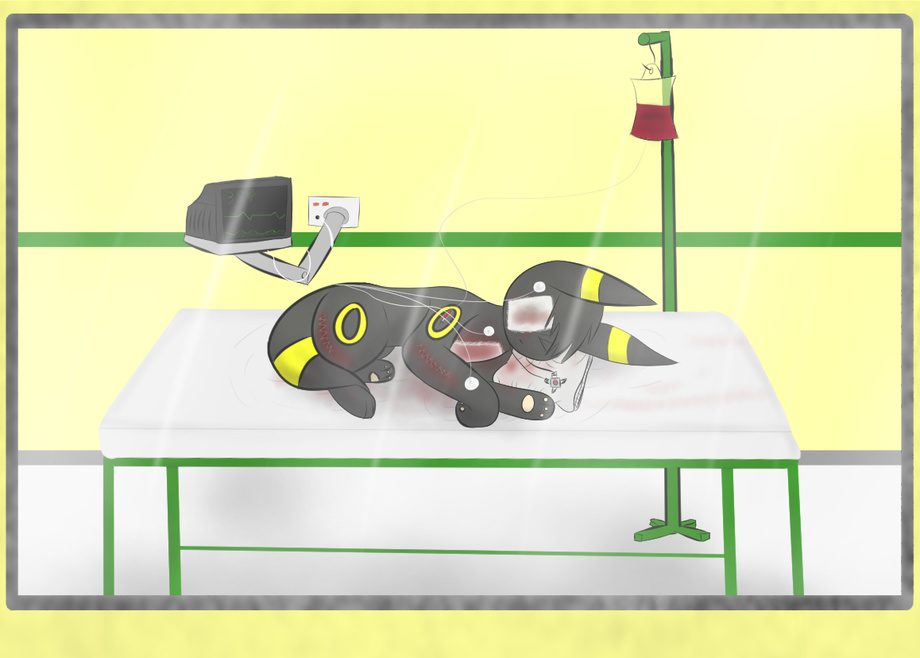 This is the first I've seen of him after we took him here, he still in really bad shape, he has three large cuts one on his hind leg and two on his forelegs, a cut over his eye and... a very large one over his chest, I couldn't bare to stare at it fearing that I might be sick. Nurse Joy told me that if he survives he'll have scars for the rest of his life, this didn't bother me much as scars you get used too but.. she said if.. so she's not even sure if he will survive either which is nerve racking since not even the doctor knows.