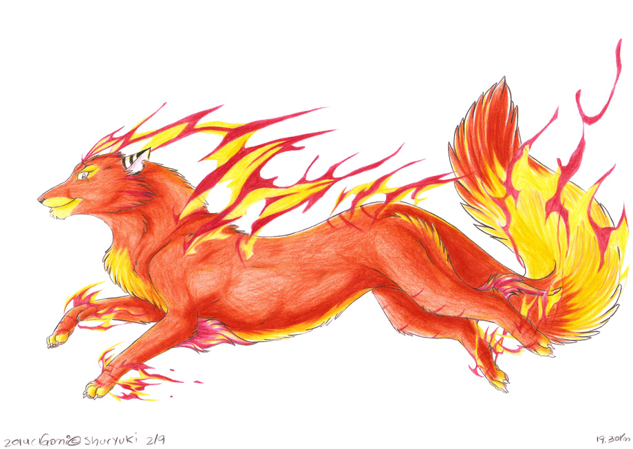 In Guardian form, Shuryuki's fur is shiny stunning orange plus the fire of the 29 red stripes (That markings have got a ritualistic meaning), her tail fluffy tail has a big stripe that expels fire too. She burns like the Sun and shines like a star, is easy watch her flying in the sky but can be murderous if you stay close to the heat expelled from her body.