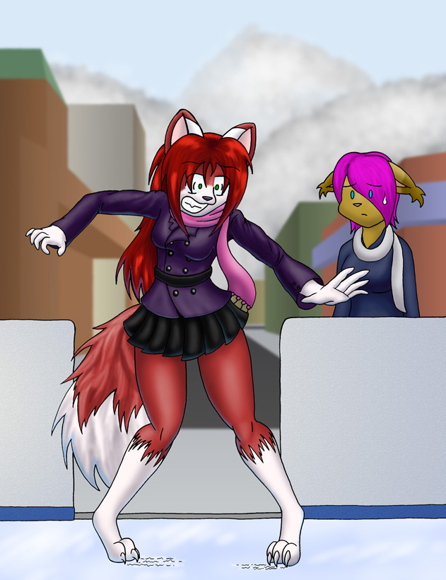 Linda suddenly felt her paws slipping and flung her arms out in a panic. A loud screech came from her claws which had instinctively extended, scraping across the ice. Her tail poofed out abruptly and her teeth clenched. She had gotten so wrapped up in talking that she didn't she had walked right onto an ice-skating rink.
