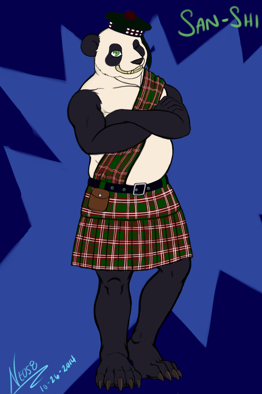 This is her character San-Shi in all of his Scottish glory. I had a good time drawing this as my first panda. this has a beard and no beard version