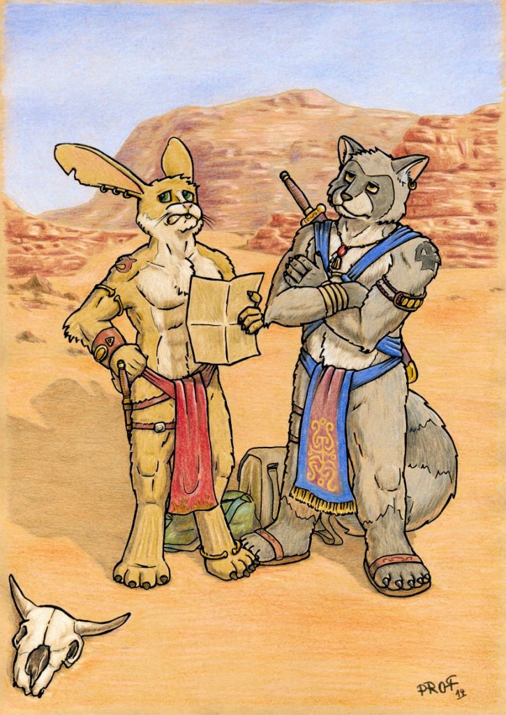 This picture was inspired by Rick Griffin 's INA stories and artworks, specially the design overhaul he started some time ago. I think it shows, particularly on the raccoon character Bromharbidi a.k.a. Brom. Him and his lifelong friend Tobi encountering a problem some of us also experienced, especially if you're playing RPG's: "F*beep* where are we?" ^_^