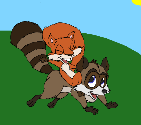 When I asked for pic ideas recently, Andy Fox suggested I draw RJ as a rocking horse-er-raccoon with Hammy riding him. I thought the idea was cute, but I couldn't quite get it to come out right. Instead, RJ's giving his little friend a romp around the forest.