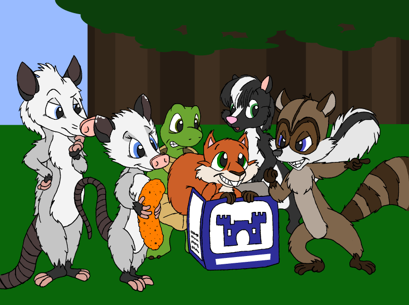 Wow, my first Ozzie, Verne and Stella all in one pic! Originally this was just a little sketch of Heather holding a cheeto FNAR. I thought she looked like she was listening to something, so I added RJ giving a speech about whatever food might lie over the next hill. That led to Hammy, which led to Ozzie, then Verne & Stella, who were surprisingly easy to draw (probly since most of them's covered up.)
