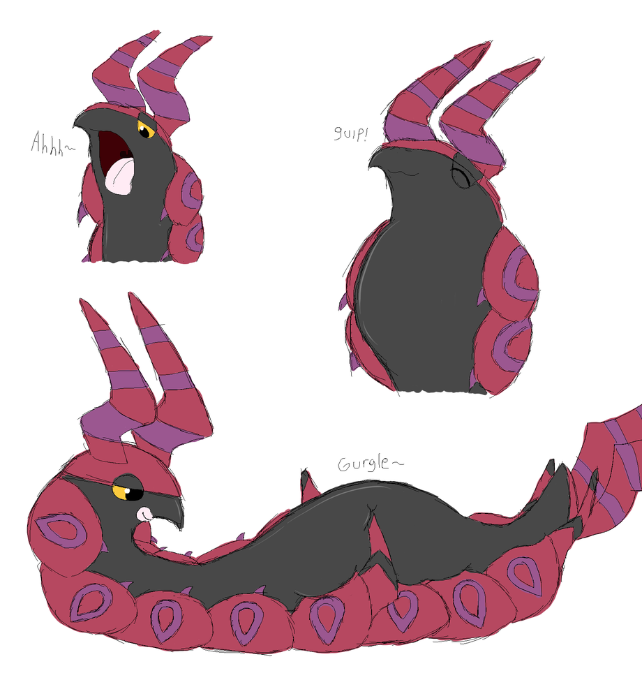 I felt like doodling some Scolipede and ended up drawing these. Sort of made a short vore sequence. Viewer goes in mouth on top left, get gulped down on right and end result is a happy and full Scolipede. Scolipede is just so squishy I had to draw it. Hope you all enjoy ^^