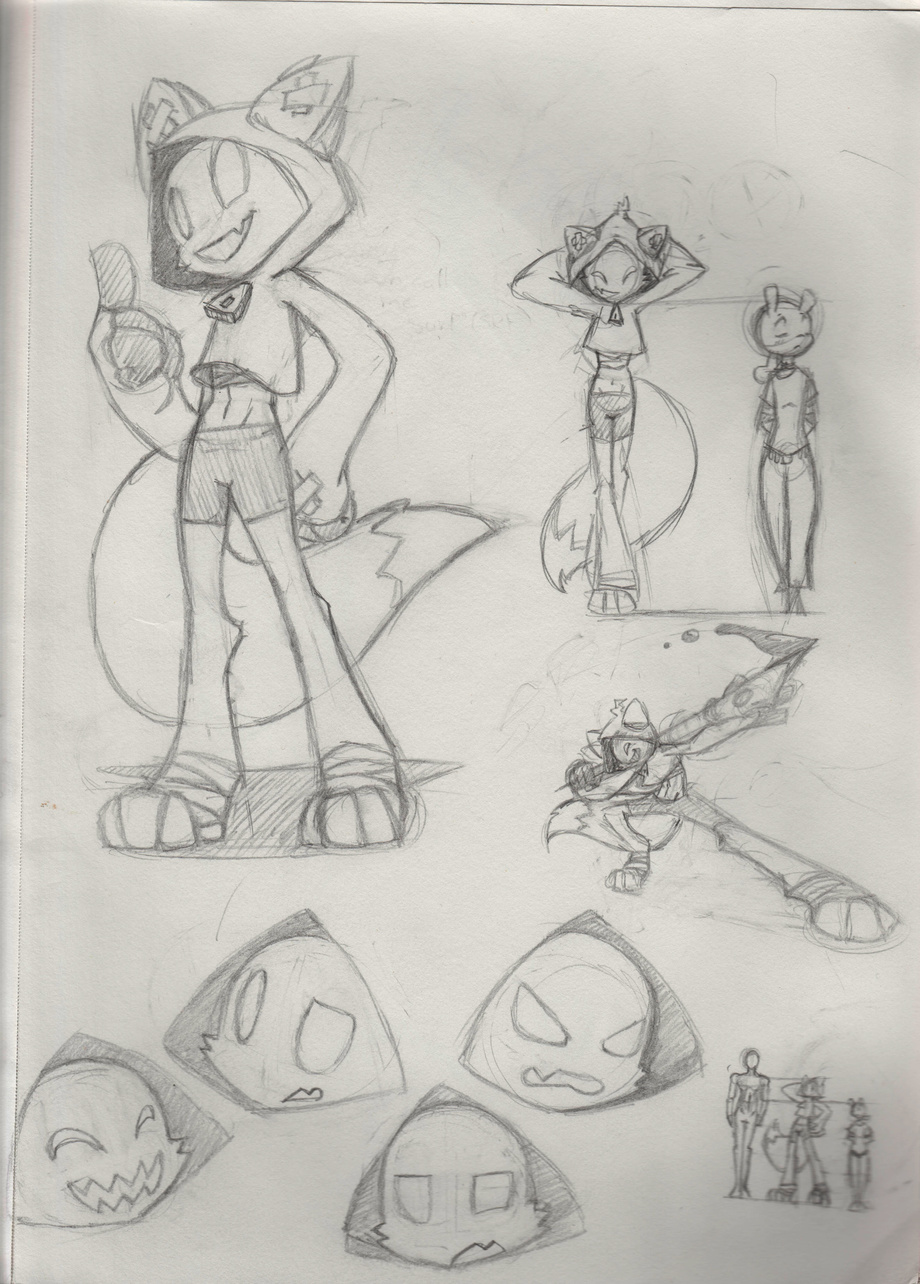 Wears a specially made hoddie of sorts. Wears black short tights, bandaging itself from the abdomen up and along the base of its paws. Glove-sleeve with black finger-sleeves. Its hoddie posses large ear-sleeves with black X marks that also seem to be present on the back of its hands