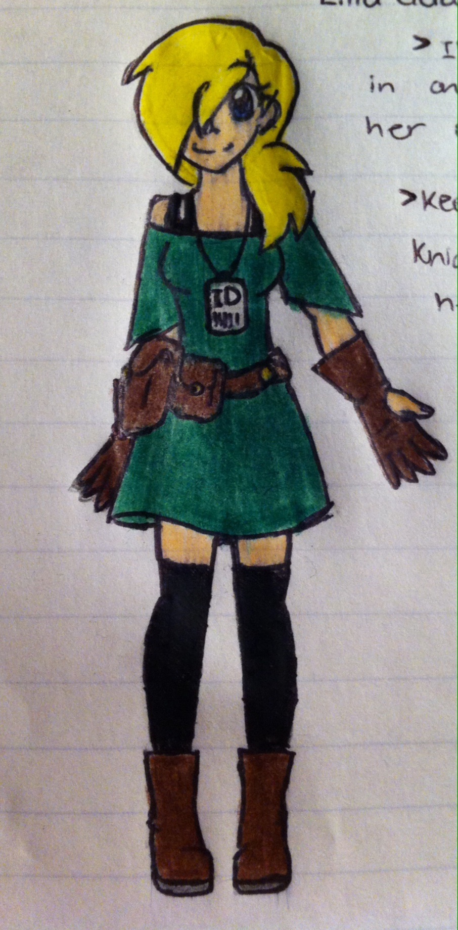 Now comparing this look to her original you can see some obvious tweeks to her design. But just in awe you can't tell, her dress is still green. My phne did something weird with her color and when I took the picture it looked teal… anyways! The I.D. card around her neck is the card her uncle stupidly gave her so she could go in and out of his fortress when she wanted. The satchels at her hips hold different knick knacks and items. In the largest one she has a grappling hook. Why? It helps her get out of emergency situations and so that no one has to carry her up high distances.
