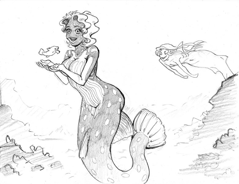 Here we find Madrid frolicking amidst a coral reef. Unfortunately for her, the approaching tiger shark mermaid (who's name I can't for the life of me remember) seems to have something devious in mind.