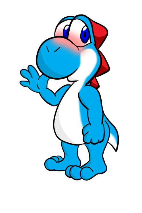 A standard cyan color yoshi with blue eyes and red spikes. He does not wear boots or a saddle and generally wears sandals and sometimes gloves, glasses or bags (related to what he is doing). The choice of sandals over boots is that his feet are sensitive and feel more comfortable with nothing on hes feet or very light, breathable shoes. The lack of saddle is he does not like people hoping on his back and riding him. He rarely wears any type of clothing because it makes him overheat very easily. While he does not like wearing clothes, he feels every embarrassed when nude (removing his sandals) or any type of covering (don't ask, just think yoshi logic and how they normally dress, aka boots and saddle).