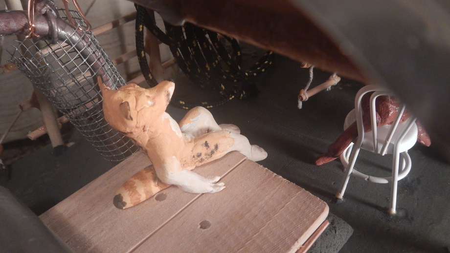 The Captain is the Fossa at the helm. Name: Jacqua Fossa The deck paw is the Malagasy Civet sitting on the engine compartment covers. Name: Aahana Civet.