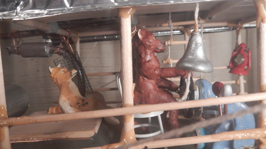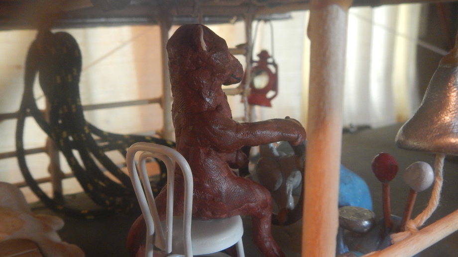The Captain is the Fossa at the helm. Name: Jacqua Fossa The deck paw is the Malagasy Civet sitting on the engine compartment covers. Name: Aahana Civet.