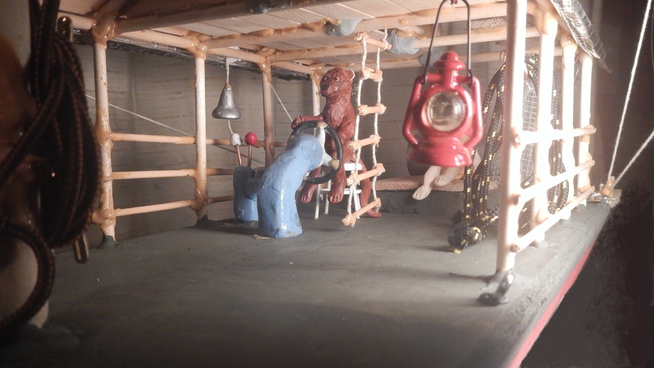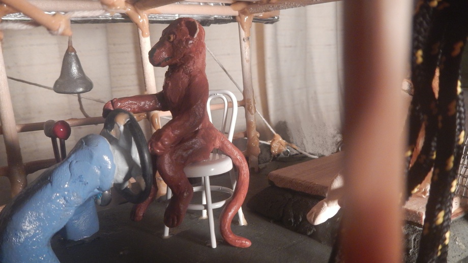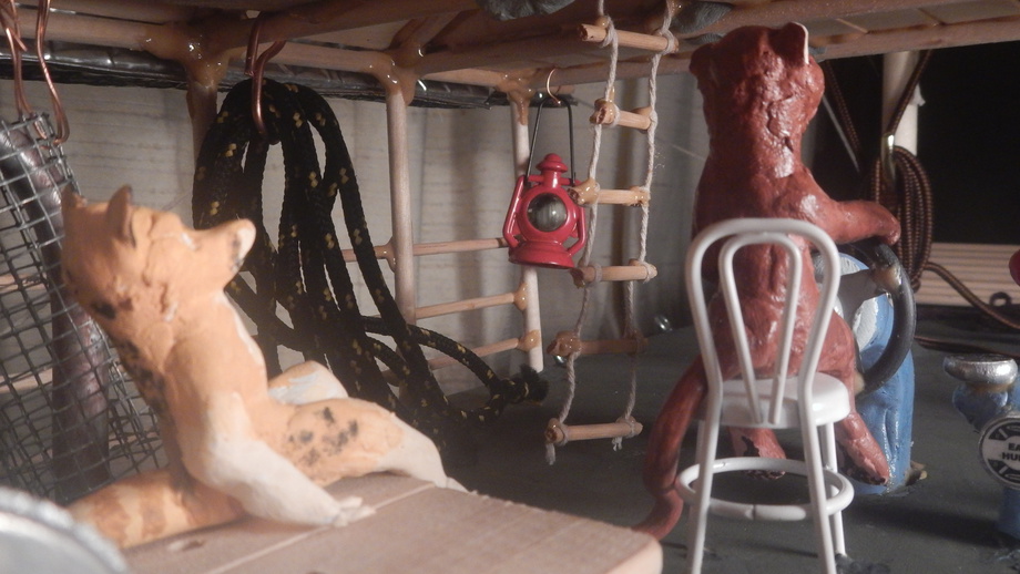 The Captain is the Fossa at the helm. Name: Jacqua Fossa The deck paw is the Malagasy Civet sitting on the engine compartment covers. Name: Aahana Civet.