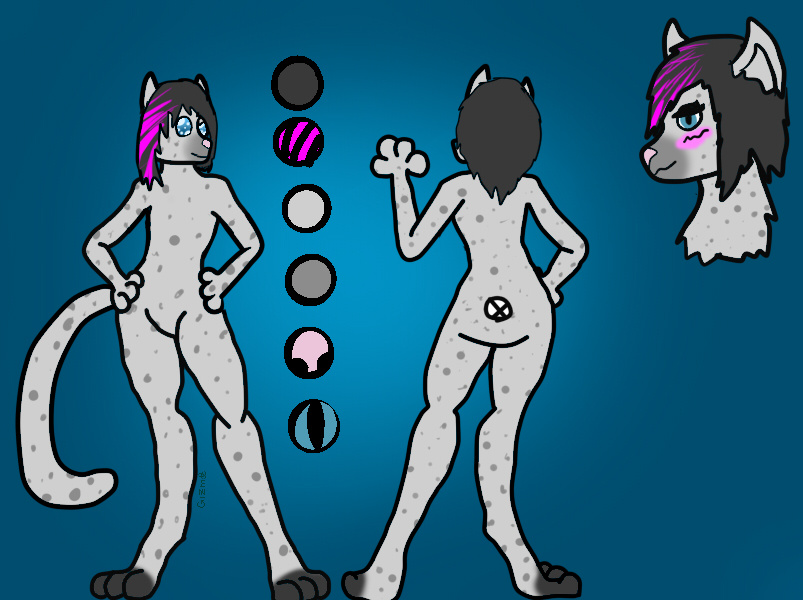 Short, thin build, light grey fur, with dark grey spots and footpaws. Blue eyes, black emo-flip hair, with fuchsia dyed into the bangs.
