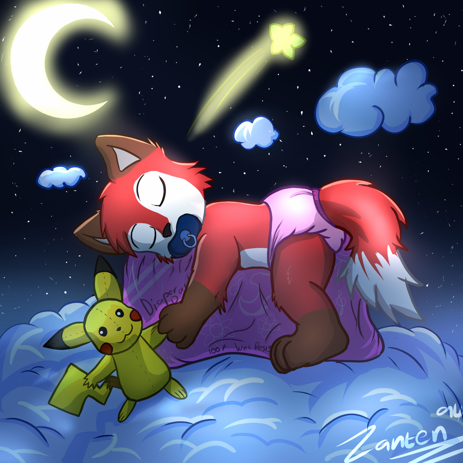 Foxy have heard from some other cub at the kindergarten that the potty monster could steal the cubs diaper so they be force to use the potty or wet there pants. Foxy dont want this to happen so he grab his pacifier and his Pikachu plushy and stay guard for 5 min when he suddenly felt sleepy so he decide to rest on the diaper package becours it was so comfy and soft.