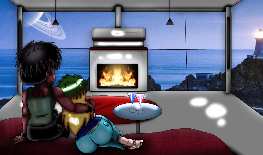 Marius, and Aluma are in a room together, drinking non-alcoholic drinks, and watching the fire. ^_^