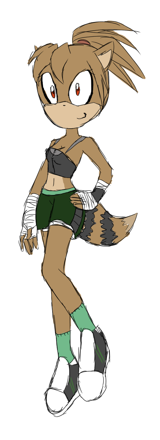 She has brown fur and a raccoon tail. She wears her hair in a ponytail. Her body is mostly toned from playing sports.