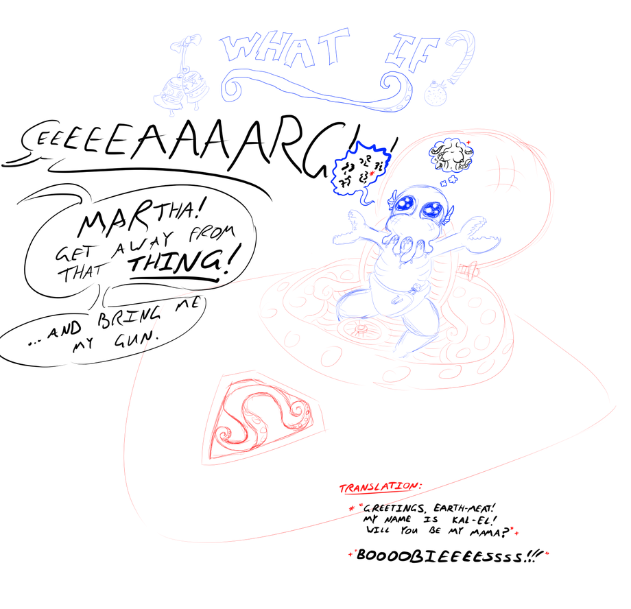 My brain went "Heh heh, cool." as it imagined a lobster-clawed alien zoidberg of a superman... and little baby zoidberg Kal-El went *POP* into existence as I pictured Martha Kent uttering an abominable inhuman shriek of horror as she set eyes upon the baby alien conqueror...