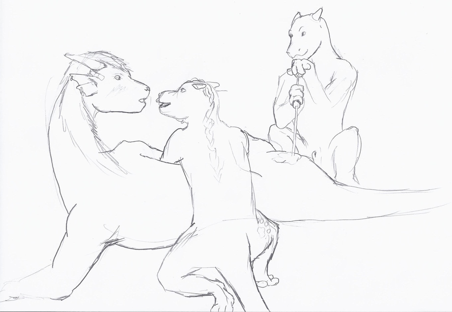 A recent convert being branded into the fold by two of the lapdragons he'll be joining, while their keeper watches from the wings. They enjoy the opportunity to help out at least as much as the opportunity to evangelize; this crowd is confident that they've found the best way of being available to them and aren't afraid to proclaim their obvious superiority. Usually it's a source of amusement, but sometimes they change minds. This one let himself be persuaded by the casual camaraderie, the complete lack of sexual tension, and the prospect of having his tail lifted at any time without warning for a quickie. (Which, perhaps, has something to do with the lack of sexual tension; that and the lack of sexual organs.)