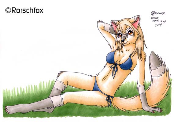 Arlena, a cute arctic/red fox hybrid fem, sitting in a field in her bikini.