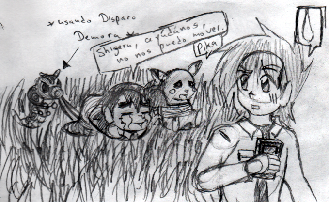 Does this picture even qualify as bondage? Ash and Pikachu ARE tied up, but nothing's happening. Gary's just confused at how in the world this sweet little Caterpie managed to defeat them.