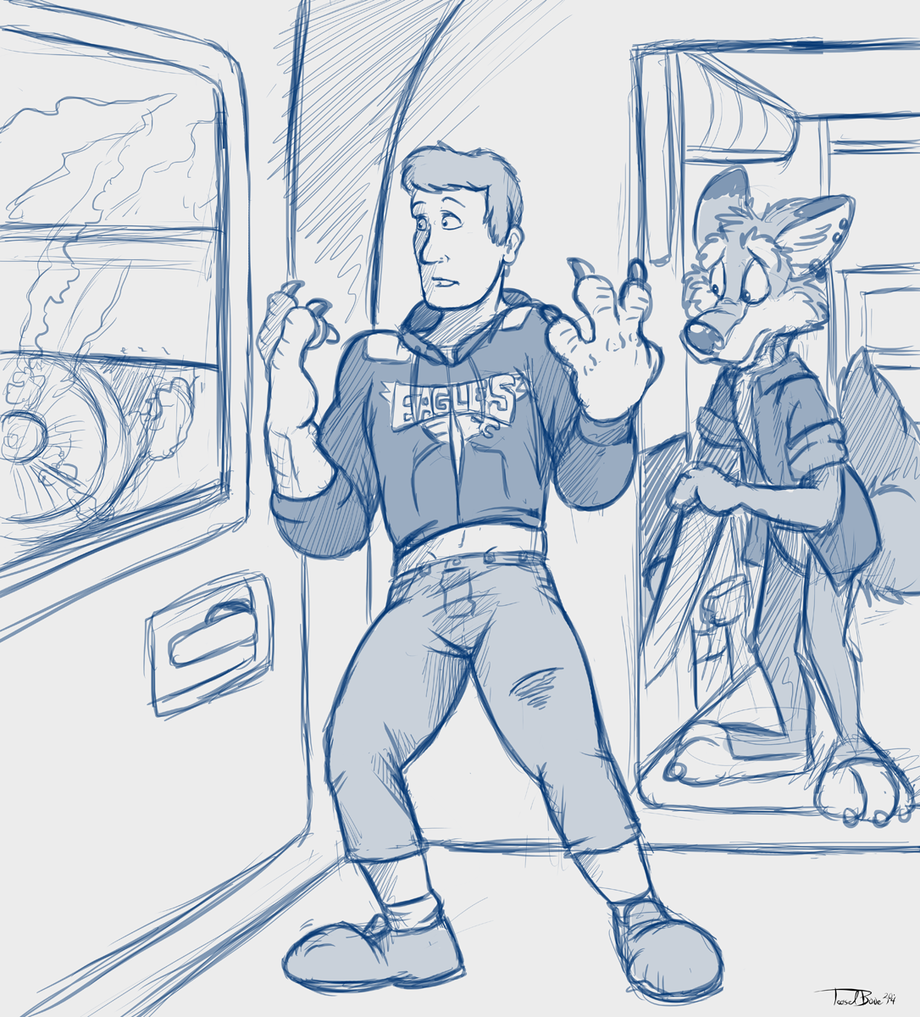 Deciding to show gratitude to @Teaselbone for all the art he's done for me, I take him on a ride in a private jet. Unfortunately, the engines fail and we start falling towards the ground. Teasel checks for our parachutes, finding nothing, but I have something else in mind, as claws begin to grow from my hands and my body starts to bulk up, straining my clothing.
