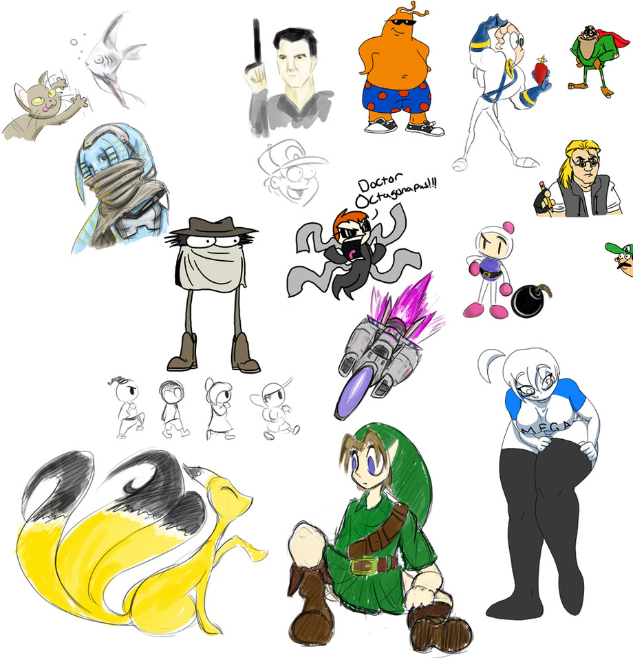 Ah, the fevered dreams of saliantsunbreeze, portzebie and AyameExGoddess. This all occurred during an oC session tonight. You’ll notice a lot of random characters in there, some original, most not. To be honest, I kinda lost track of who was drawing what for a while. I just know which ones I’m responsible for. And the Zelda one because that just screams Sali’s style.