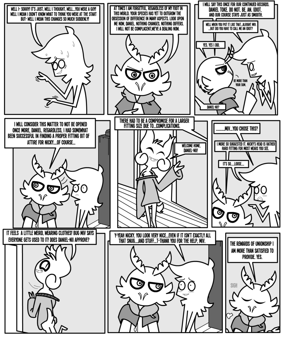 The more I think about it, the more I'm bothered by the idea that whatever place Miv comes from doesn't acknowledge and/or celebrate the differences between people the way humans do. I mean, sure, sometimes we get much too caught up in some specific differences, but if you don't focus on the things that make each individual different and separate from the ones around them, how exactly do you relate to them as an individual? <_<;