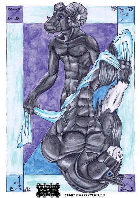 Commission for Flare Starfire (the musical Shire) of the dichotomy of his characters. Featured here are Zeryx the black sheep ram and Flare Starfire, the gentle Shire horse giant. Fully reversable and designed specifically so that it could be shrunk down into a convention badge.