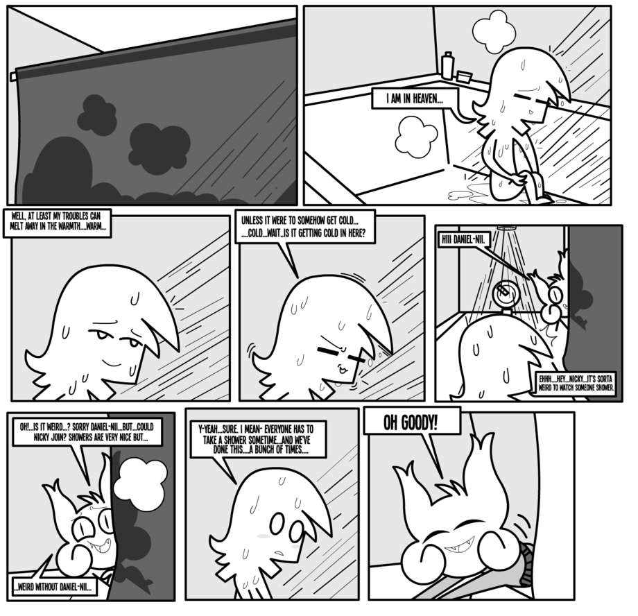 Dammit Nicky, you've only just started wearing clothes and you're immediately getting them all wet. Now Daniel-Nii is going to have to peel those wet clothes off your warm, furry body...