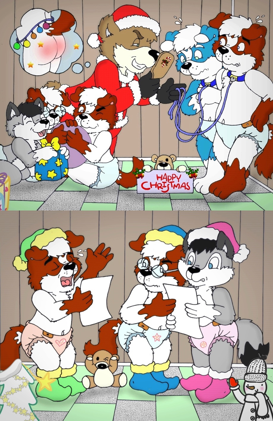 The school and the Pawpers Company have prepared a big celebration for christmas. And so it is going to be one big play with lots of caroling, and as you can see the pups are preparing their big song. But they'll be a story about naughty adults getting punished for making their cubs' life miserable. And who get to play the Santa Paws to deliver the gifts and the punishments ? Nothing else that profesionnal babysitter Tony the bear. And who play the two naughty adults that ruined their cubs' celebrations, and end spanked and humiliated ? Matt and the Boss ! Which learned about their final scene only at the end of the spectacle, when suddenly they felt themselves undressed and diapered in front of the public... before lining up for a sound spanking !