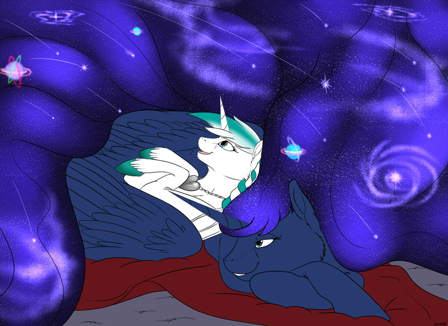 Nyota nods then was gently tackled by Luna's wing. She giggles at her Mama, then she saw Luna's mane grow to immense size and chance color. She looked at is as it surrounded them and then she saw what the clouds and distance kept her form seeing. Her here now saw the hidden beauty of her adopted mother's night. the endless stars and planets and galaxies. She gazes in amazement laying on her back covered by Luna's wing. She was amazed "Mama, its so beautiful!" Luna smiles and kisses her daughters cheek "This is my gift to you my sweet Star. Happy Hearths Warming Eve". All night the two gaze at the events of the galaxies and universes through Luna's mane. this was the BEST Hearths Warming Eve in Nyota's, and even Luna's, life.