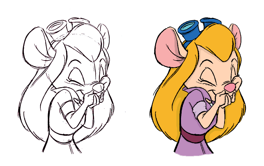 This is an image from one of Gadget's model sheets. It was really just a sketch there, and a liney one at that, so I cleaned it up as best I could and splashed it with color. Tada!