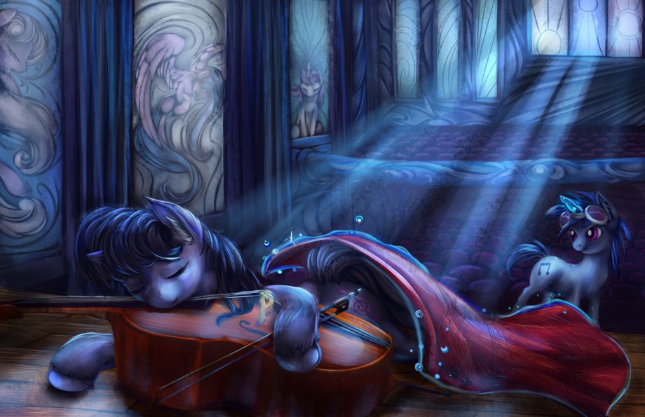 After an extensive night of practice, poor Octavia has fallen asleep at the helm. Fortunately her roommate Vinyl has come to check up on her and brings a blanket for her comfort.