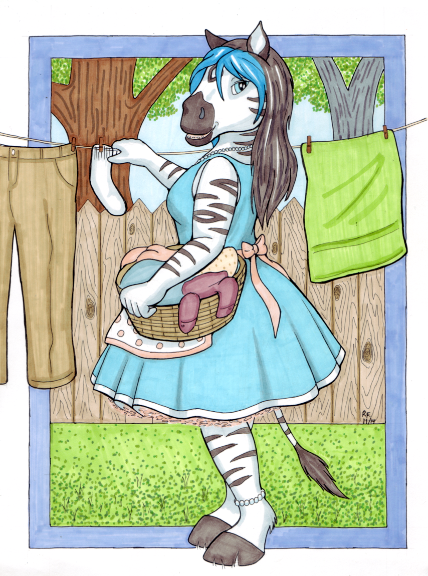 Commission for Lauren Rivers... her zebra girl, as a 1950's housewife, doing the laundry while her partner is away at work.