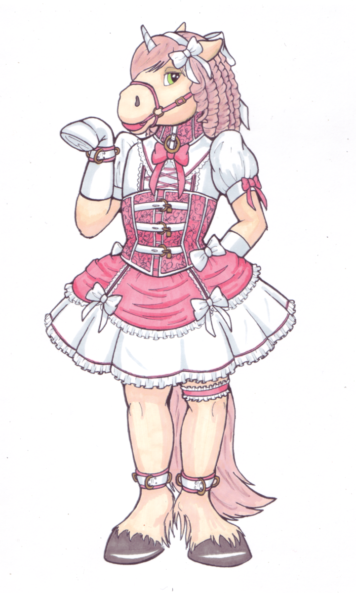 This outfit features locking cuffs, hoof-mitts with locking cuffs, a bridle with a ball gag in place of a normal horse bit (although a bit can be attached, if desired) And the dress is made of satin, complete with a lightly laced locking corset. Yuki cannot remove this outfit by himself, and is kept in diapers to prevent accidents when wearing it.