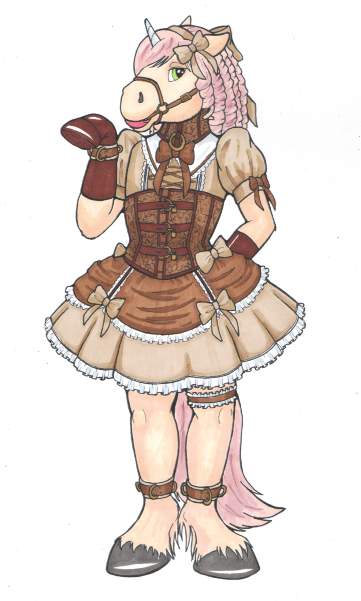 A bondage outfit design I did for my sissy unicorn boy, Yuki. I originally drew the blue dress, but I wasn't so pleased with it, so I tried other color combinations. The brown steampunk-ish one, and the pink/white ones are my favorites...what are yours?
