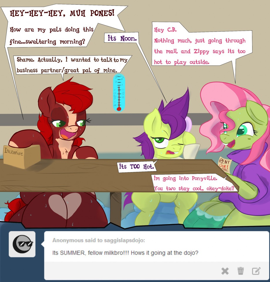 Trapped inside, bored and no AC, Zippy only has his hoof to keep cool. Chocobelle is even lazier when its hot, sleeping past her morning milking session and that only intensified the dojo’s heat for her.