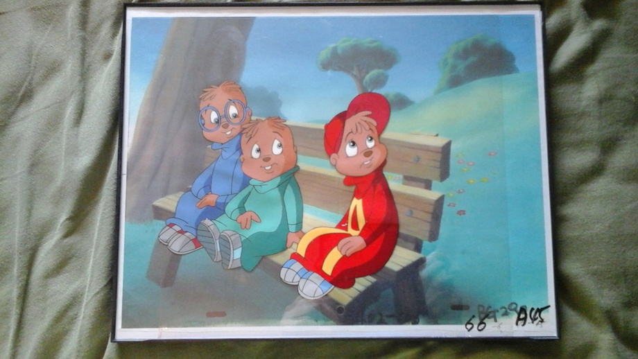 This is a Cel Art piece I got over Christmas of Alvin and the Chipmunks . This one is from the Animated Easter Movie made in 1993.Two cels put on top of the backround to create the shot. This is a awesome art piece and part of my childhood ^^.