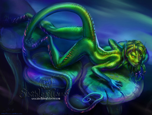 -Her body is covered in smooth shiny scales and torso is slightly curved in feminine shape. Bones and joints are not distinctly pointing out, but are covered with sleek scales to give an overall smooth appearance with no bumps. Hands have thin razor sharp claws that are good for digging and grasping onto sides of things and climbing. The insides of her hands and bottom of feet have a suction grip like a gecko. So she can easily crawl on a difficult surface or ceiling if needed.