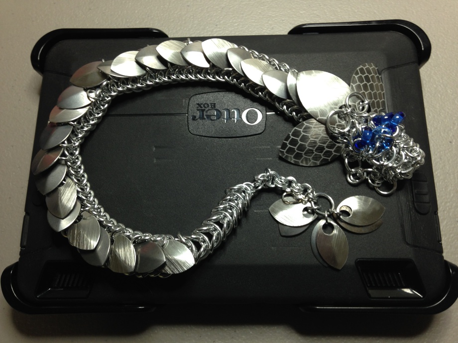 He is made with bright silver rings and brushed aluminum and mild steel scales. He has a handflower ring and four eyes.