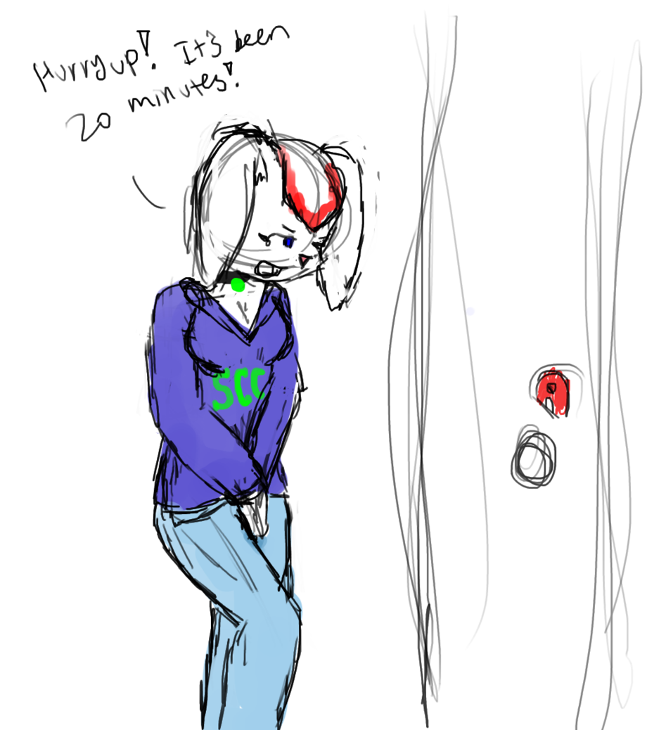 However, 20 minutes later, it is obvious whoever is in there won't be coming out soon. This is the only single restroom on campus, as she doesn't go in to the ladies room for obvious reasons. (New followers, Sage is a hermaphrodite who doesn't want others to know about her extra bits.) Poor girl has been waiting for so long. She can either continue to wait for risk of being late to class, or try again after her lecture.