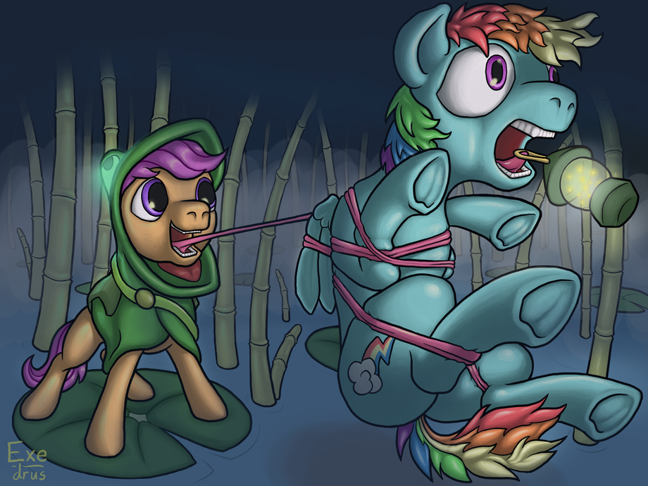Scootaloo wakes up in a swamp with no memory of how she got there, nor how she wound up wearing a Frog suit. She wastes no time in figuring out that the strange garment grants her a few interesting abilities, like the ability to jump farther and much more nimbly than before, as well as the ability to grab far off things with her tongue. While playing around with these new found powers, she happens to hear Rainbow Dash in the distance, and quickly moves to find her. After a few frustrating attempts to get RD's attention from afar, she decides to attempt a more direct means of grabbing her mentor's attention. Rainbow Dash reacts as a pony would expect one to react to being suddenly ensnared and dragged backward thought a dark, foggy forest.