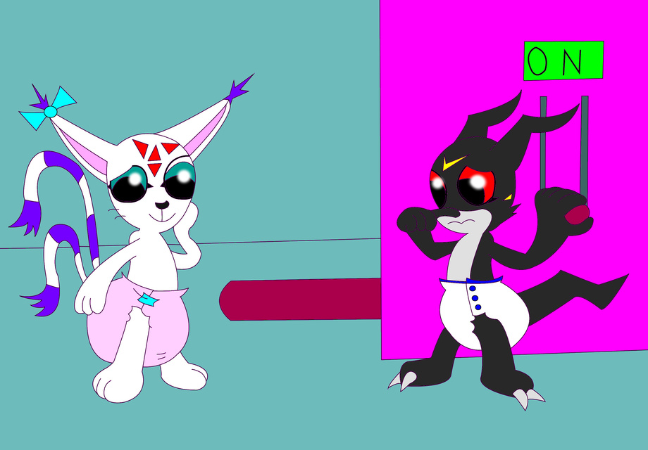 This picture features the return of Jerid, the mechanical genius Black Veemon. His finally worked out the bugs in his automated diaper change machine. He invited Amy over to show her his masterpiece. But when Amy's diaper bulges out, Jerid realizes he must give her an unplanned demonstration.