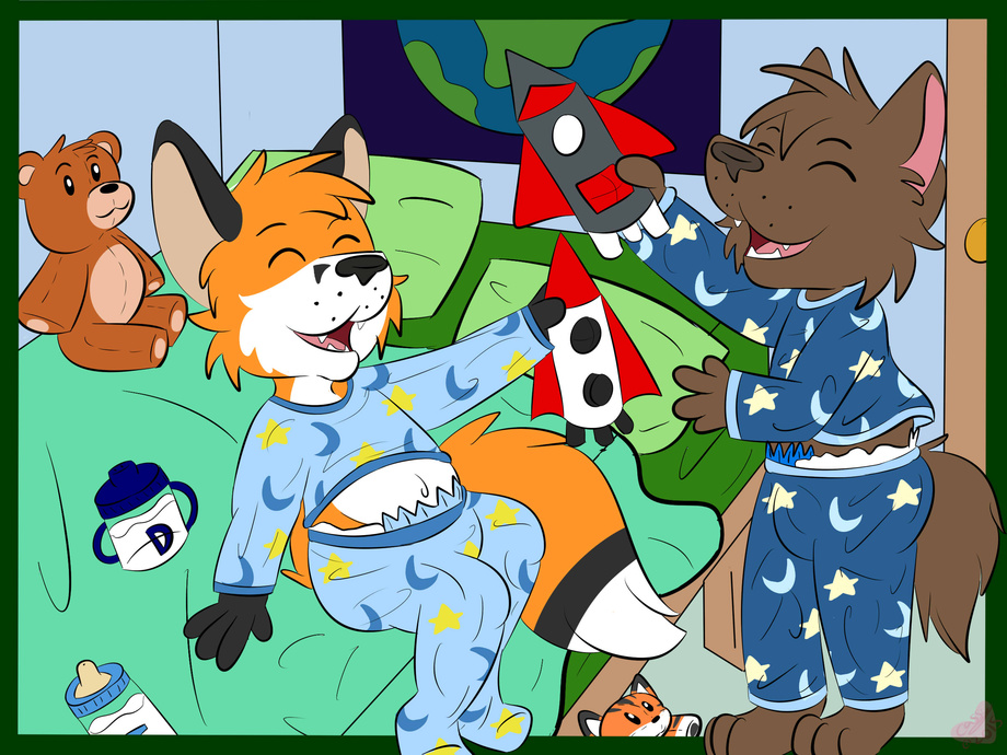 commission for snuggems of his character jeffy and his friend doge haveing a slumber party and playing with there rocket ships!