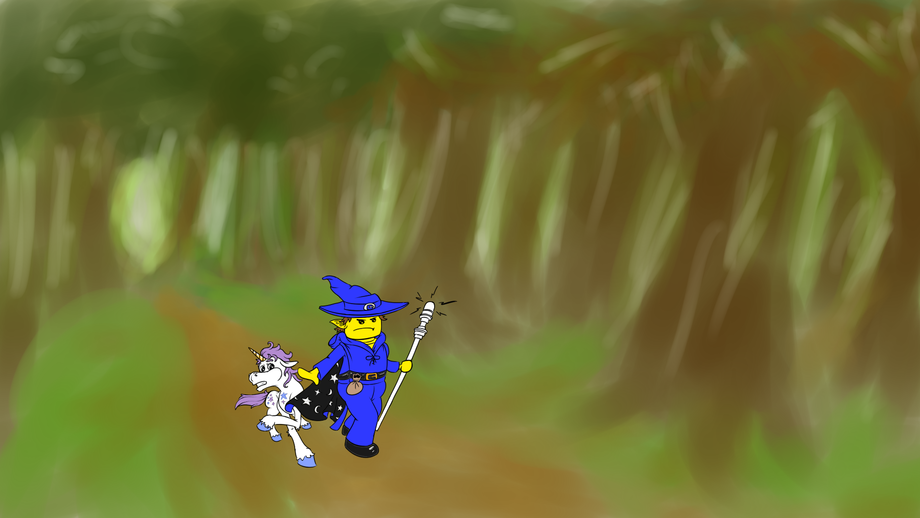 The background was made a week or so ago, when I got that animating bug, intending to use it as a guide for a walk cycle... in perspective. Yeah, don't know WHAT I was thinking. Anyway, I thought to myself that if I coloured the wizard, his staff and unicorn familiar would look incomplete... and while pondering what colour to scribble behind them, I was reminded of my attempt at "painting" a forest path... oooh, just think of all the horrible (and humorous!) things I could hide behind those trees...!