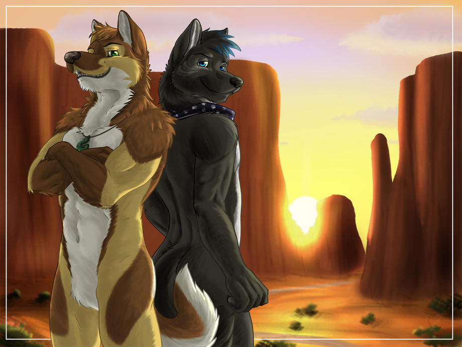 Roan is the coywolf on the left and Lace is the black wolf on the right.