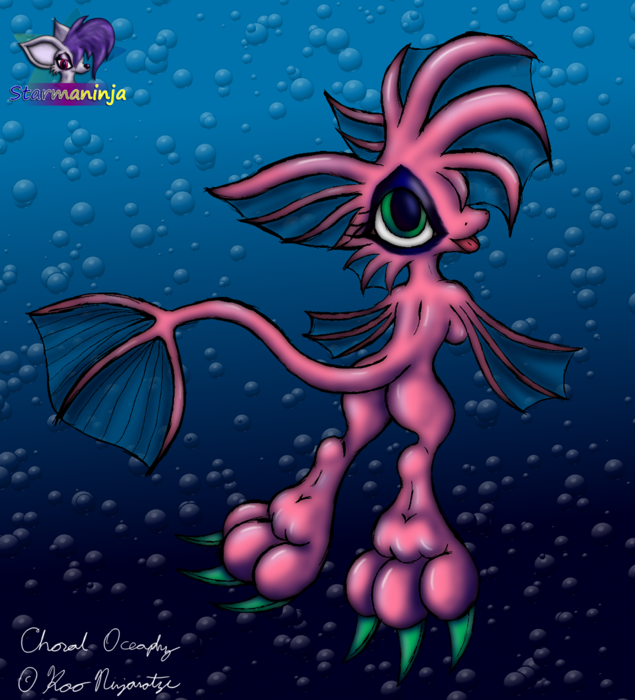 Bio: Choral's egg was laid in Coral City, a suburban area deep under the waters of Ocealand. However, when the Intruders attacked her homeland using Marine's abandoned base, her parents were kidnapped, leaving the egg to drift away into the Coral Gardens. Queen Runia found her egg while scouting the area for any survivors in hopes she could find clues to why the Intruders attacked the place so randomly, but came across the egg hidden in the garden, which served as a clue. When the egg hatched to the Queen's warm touch, out hatched Choral, who immediately seemed to understand something was gravely wrong. Without much hesitation, she swam around in attempt to find and save her parents, which startled Queen Runia, but the Queen managed to calm her down and told her that they'll find her parents together. With prayers to the God of Ocealand, Admiral, (and her father), she managed to give Choral the strength to fend for herself if she had to, but she knew deep down in Choral's body, there was a spirit that housed a lot more energy than even an adult Starmaninjian. She swore she would protect Choral with all her strength out of fear the Intruders would be looking for her, while Choral continued to display increasing abilities that really show even an infantile Starmaninjian isn't easy to take down.